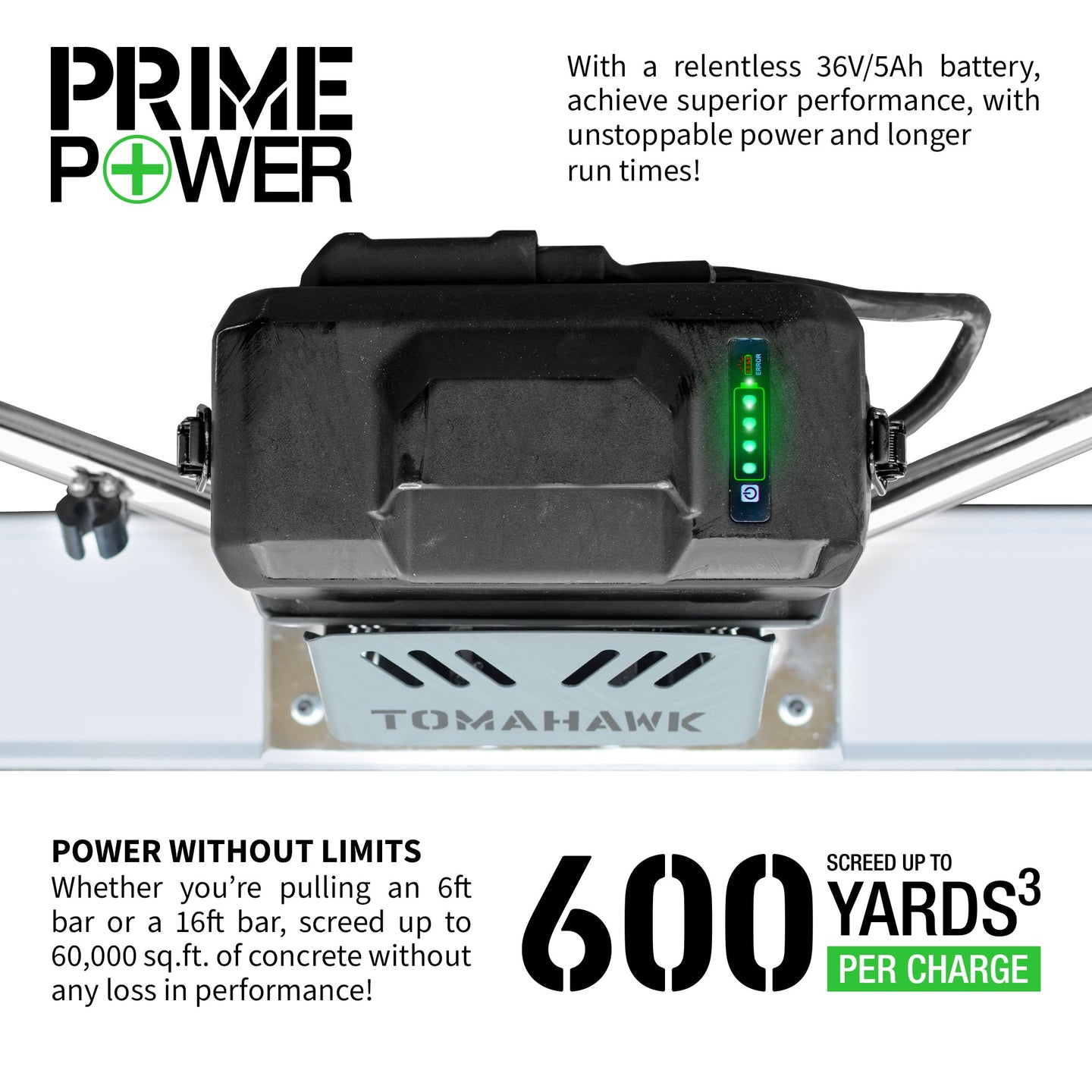 TheTomahawk PatentedBattery Screed is powered by a relentless 36 Volt / 5 amp Hour battery, easily pour 600 cubic yards of concrete with enough power to keep the trucks coming!
