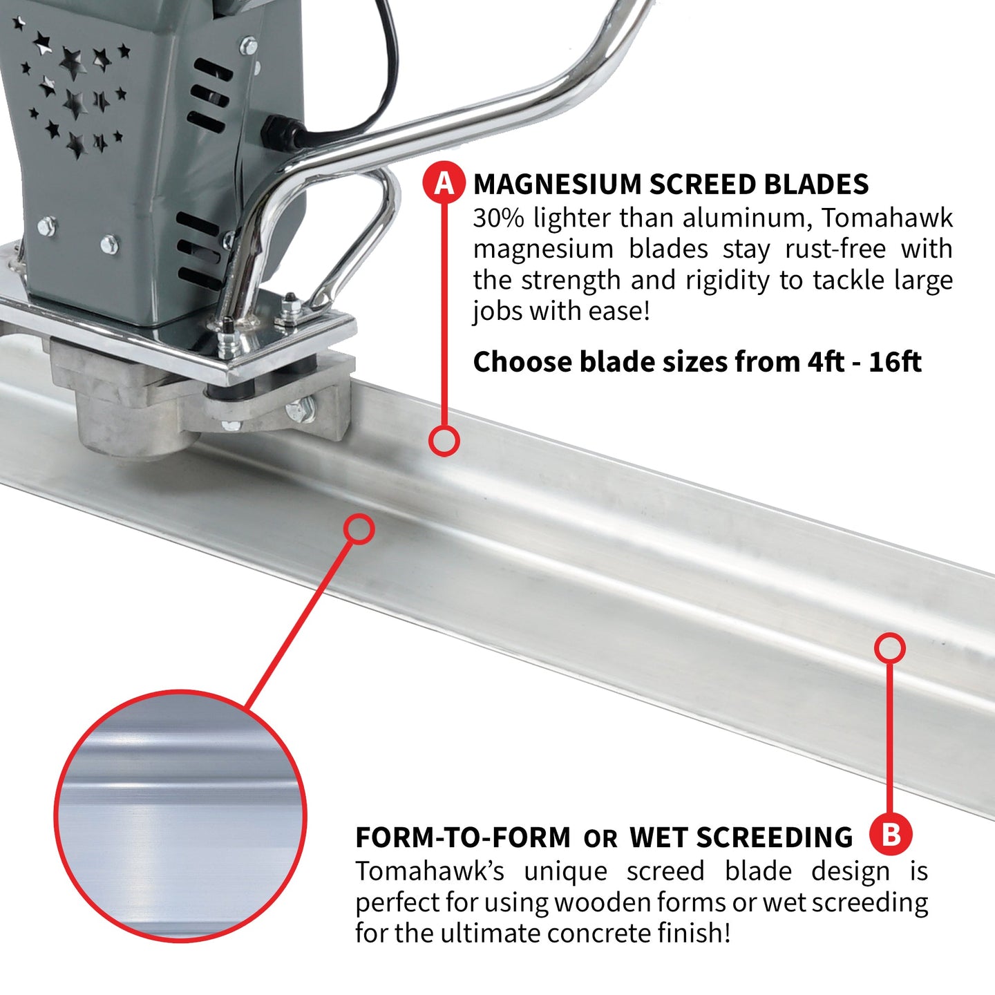 Tomahawk's unique screed blade design is perfect for using wooden forms or wet screeding for the ultmate concrete finish!
