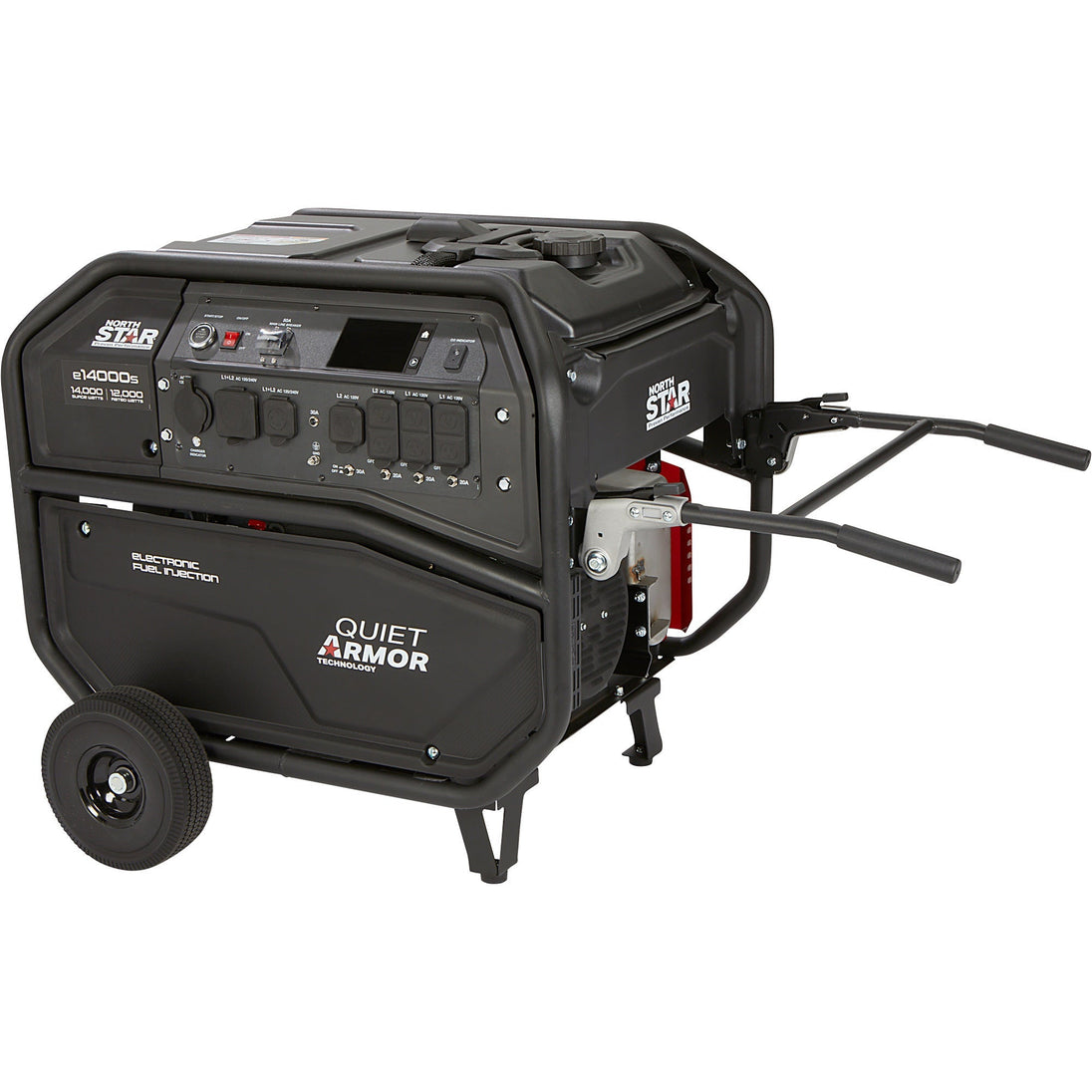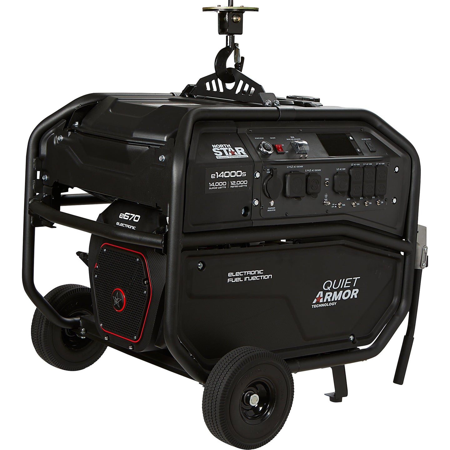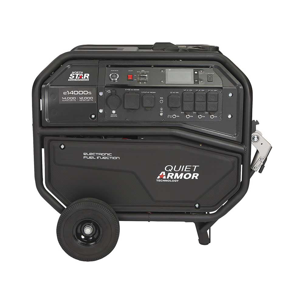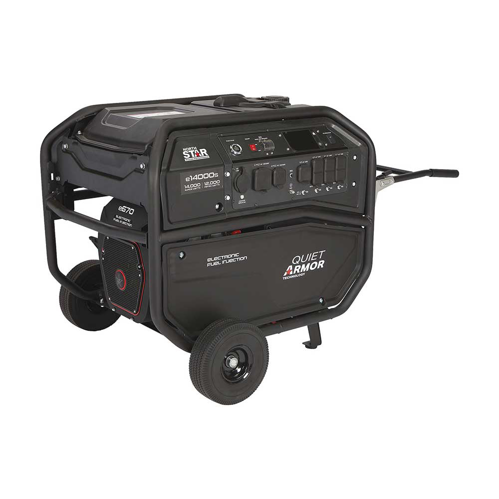The NorthStar e14000s commercial-grade EFI portable generator with electric start is the ultimate, high-powered, high-performance power solution for demanding job sites. Powered by a NorthStar e670 OHV EFI engine, this ruggedly constructed generator is built for extreme durability and safety. A heavy-duty steel exoskeleton and premium components provide the reliability tough jobs require.