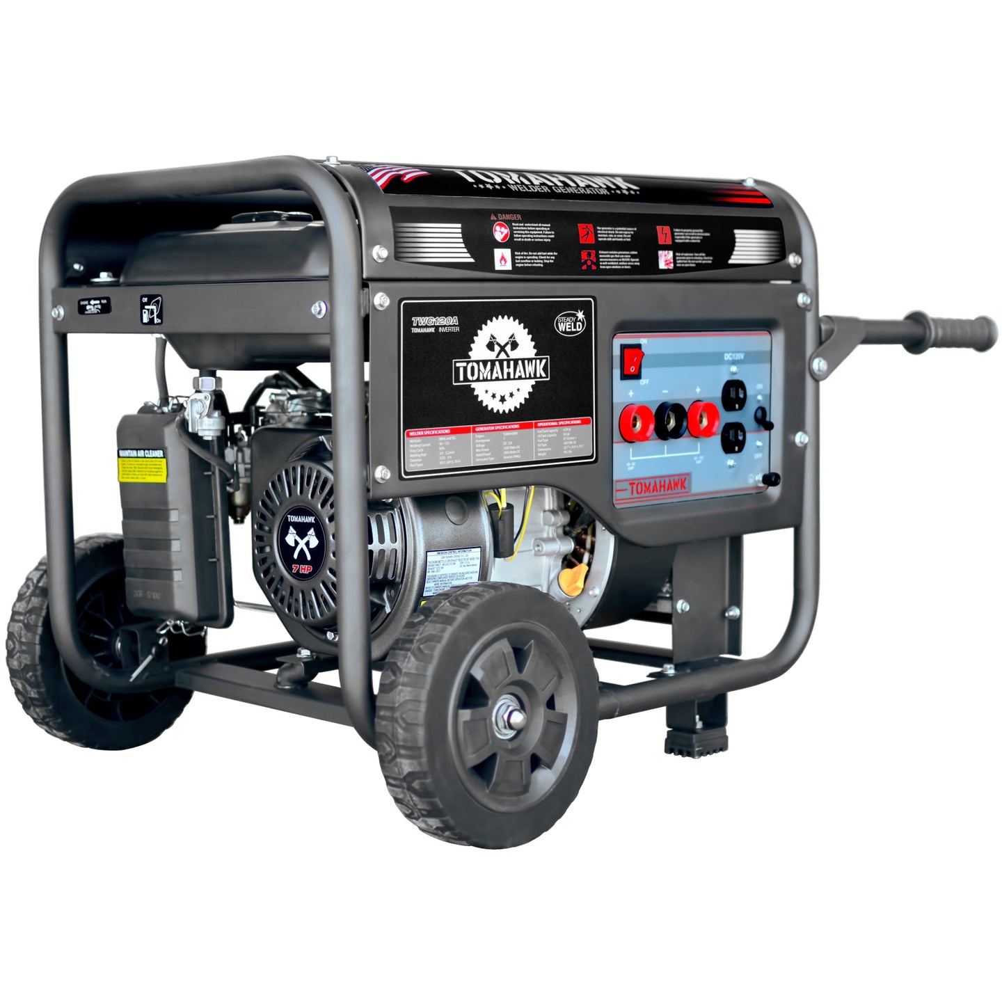 The Tomahawk TWG120A Welder Generator is designed for high power and durability. Ideal for farms, workshops, or any job that requires electrical power and CC (constant current) stick welding. Producing up to 120 Amps of DC output with a 60% duty cycle, it is suitable for welding from 6010 rods up to 6013 rods. Convenient back wheels allow for maneuverability for portable onsite welding and can also be used for emergency back-up power when necessary. Featuring Tomahawk’s incredible 7HP engine, with 2200 watts of DC output, this welder generator will provide you with the power you need wherever you need it. The Tomahawk TWG120A is an excellent tool for job applications at your workshop, ranch, or farm - and is backed by a 1-year engine warranty.